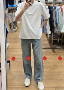 - 色彩呼應法則:讓妳的鞋子、帽子、或內搭 T 恤的顏色,與牛仔褲的顏色(或刷色)有所呼應。例如,穿淺色牛仔褲穿搭男時,可以搭配一雙白色或淺灰色的球鞋。