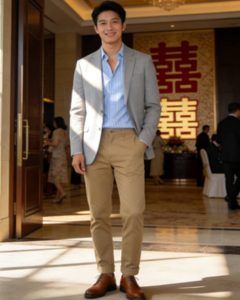 淺灰色休閒西裝外套(2500-4000 NTD)+ 白色純棉襯衫(800-1500 NTD)+ 卡其色休閒褲(1000-1800 NTD)+ 棕色德比鞋(2000-3500 NTD)。這套搭配適合大多數婚宴場景,休閒中帶有正式感,不會過於老套,淺色系還能凸顯清爽氣質。